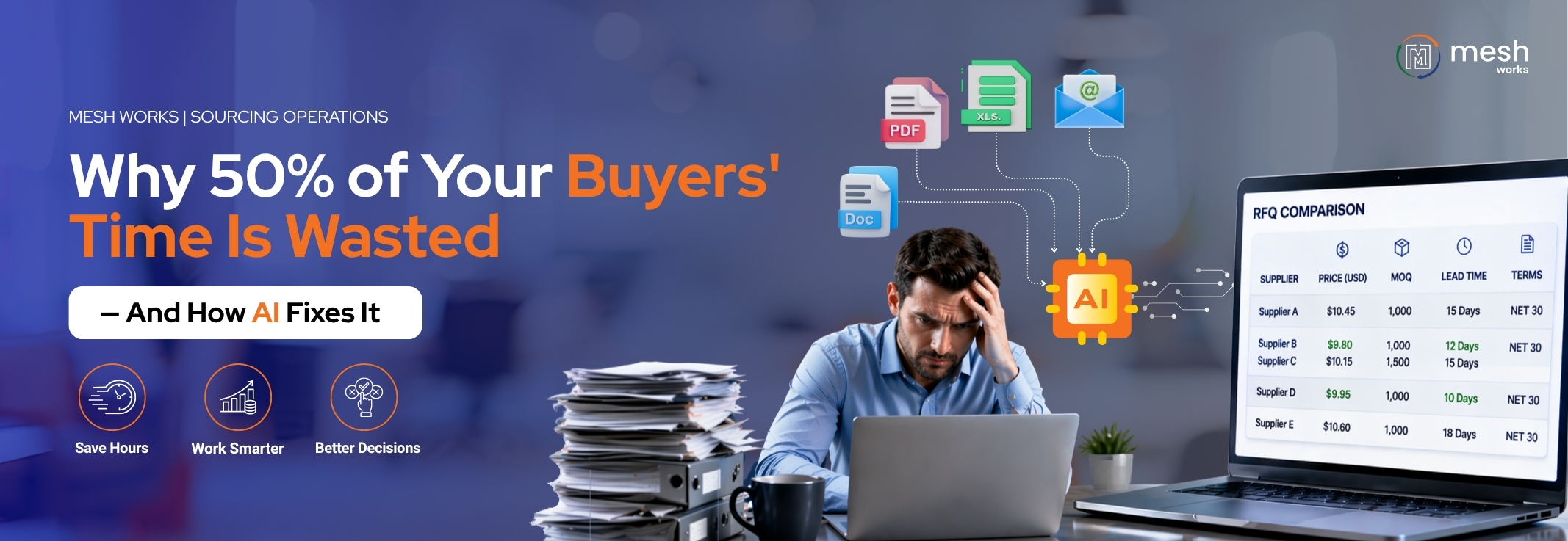 The uncomfortable truth for most sourcing leaders is this: over 50% of a buyer's working day is spent on mechanical processing — not sourcing. Not analysis. Not supplier development. Not negotiation. Processing. Data translation. Format wrangling. Spreadsheet maintenance.